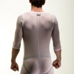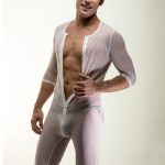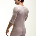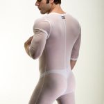 If you are familiar with their previous Onesie, it’s the same design but with a mesh white or black fabric. The design has a 3/4 sleeve and leg. This is not going to be a pair to keep warm in. You may get hot in it but for different reasons. Personally, I like the pics with a thong or jock under. Just something super sexy about that look to me.