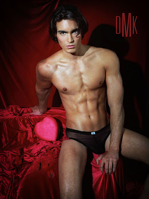 Seductive Lucas Brosette works his Valentine magic with photographer Peter D. Brown in a DMK underwear shoot ( www.DMK-Designs.com ). The New Orleans native is a sultry mix- mostly French with a little Latin spice thrown in. His deep gaze seduces you- staring out under those sexy ultra thick dark brows The newly New York based actor/model wears DMK’s cranberry Low Rise Swimmer, red velvet & sheer styles (velvet pouch and sheer front versions) … and, well, finally he wears nothing but his ‘heart on’- his lean muscled physique. Look for more of Lucas soon…