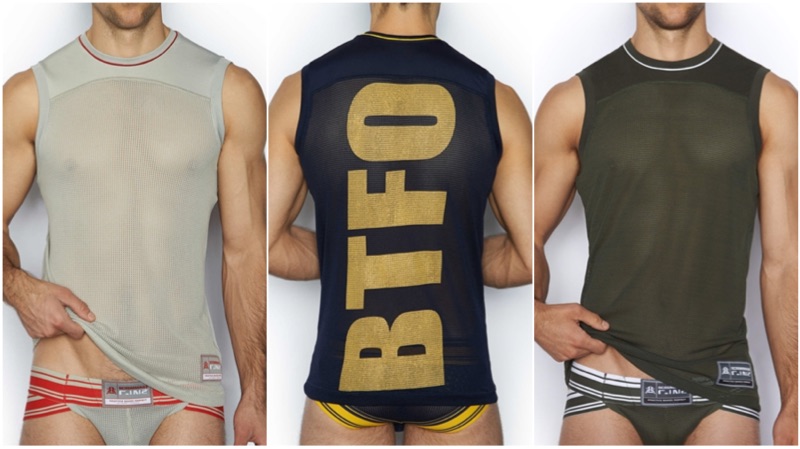 The collection consists of the Scrimmage Hustle Brief, Jockstrap, Lowest Punt, Lift Tank, Tackle Gear Crew and theTackle Gear Long Arm. The colors available for the underwear are Appalachian Grey, Michigan Blue and Moss. The shirts are available in the same colors except the Lift Tank which is just the Grey and Blue. The Scrimmage line is made out of 100% polyester.