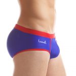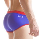 This pair is available in three colors. Black/White, signature Purple/White, vibrant Royal Blue/Red. The pair we are profiling is the Royal Blue/Red. The fabric is a premium lycra fabric. This means it will fit amazing and hold it’s form all day. TheContrasting, ‘Lunch stripes’ inner lining on front contour pouch sets the pair off nicely. Lastly, the Lunch signature purple lunch loop tag on front trim detail.
