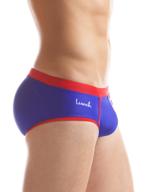 This pair is available in three colors. Black/White, signature Purple/White, vibrant Royal Blue/Red. The pair we are profiling is the Royal Blue/Red. The fabric is a premium lycra fabric. This means it will fit amazing and hold it’s form all day. TheContrasting, ‘Lunch stripes’ inner lining on front contour pouch sets the pair off nicely. Lastly, the Lunch signature purple lunch loop tag on front trim detail.