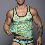 The new line comes in a few different styles. They are jock, brief, shorts, swim trunk, swim brief/Bikini and tank. You could, in fact wear all banana print with this line. Not sure you will but it’s an option. I could see the tank being worn with jeans or shorts.