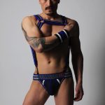 The new jock/harness is super hot. Each is sold separately. The jock has a neoprene pouch with fabric on the side. This gives it a little more movement than 100% neoprene. It should conform and be a lot more comfortable throughout a wearing. There is a “custom-made 2” logo waistband, nylon/spandex piping and butt straps for an amazing look, fit and comfort. Wear it as-is or with the matching Rogue Neoprene harness attached to the two D-rings in front for a full fetish gear look.