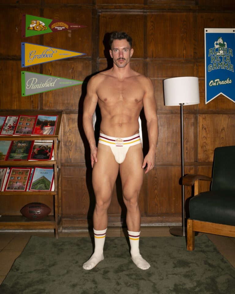 Retro vibes meet everyday performance with the Brotherhood Jock (Ivory) from On Track’s throwback Brotherhoodcollection — a nod to classic athletic heritage with a modern twist. Built with a supportive ribbed pouch, a varsity-striped waistband, and an open-back cut designed for freedom of movement, this jockstrap delivers comfort whether you’re in motion or just going about your day. Crafted from soft, durable ribbed cotton and finished with the iconic Brotherhood emblem up front, it’s the perfect blend of vintage spirit and contemporary wearability.