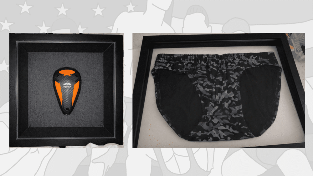 Similarly, my second idea is shadow boxes, because some gear is art. I have completed these two boxes. The first is a square shadow box containing an athletic cup. I love this because the Shock Doctor cup is a classic in design and stands out on the black. I have been debating putting lights on the inside as well, but that’s for phase two. The second is a Jockstrap in a shadow box. I chose the jock just for the classic jock icon status, but it can also include white briefs, bikinis, Speedos, thongs, and more. These two can have lights inside as well. These would not be cheap. So far, I estimate about $75 for the cup (due to the deep shadowbox needed) and about $60 for the underwear. I could put in a favorite pair or a new pair. But if I did a used pair, it would have to be freshly laundered and sent. The prices for shadow boxes are not bad for custom work. I’m looking at different backgrounds depending on the pair (such as complementary colors to make it pop), but these are both off the shelf, and I wanted to make sure I could make them happen before I invest too much in them. If you wanted a custom pair, I could either order it and put it in the box, or the customer would have to send it to me. I believe I could do singlets or spandex shorts as well. But that Price would be around $125 or more, and shipping would be interesting. (Note the swimwear didn’t turn out well, the shadow box was too small and I couldn’t stretch it as much as I needed, Also, it was a small and still too big for 11×17, going to try with a 16×20 with another pair and try again, but the cup turned out amazing)