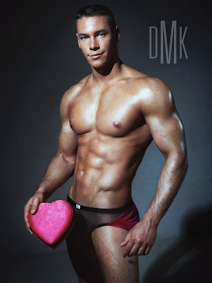 Anton Antipov shows his tan muscled physique off in DMK’s hot new Valentine’s Day Underwear shoot. Those crystal clear, teal eyes stare out and pull you in-(as if his sculpted rippling anatomy in clinging velvet/mesh underwear weren’t enough to grab you!). Photographer Peter D. Brown (www.peterdbrownphoto.com) shot our favorite hot blooded boy from Belarus in a lush deep red velvet DMK designs over a sheer black mesh. In the pouch front version just enough is revealed- including a low cut slice of sheer over those well developed round glutes! The sheer front style leaves less to the imagination- well, except Anton is holding his “heart on” over this thigh. See more of Anton in DMK at www.dmk-design.com