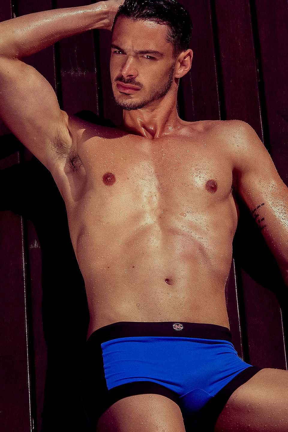 Adrian C. Martin shot tattooed model, Alain Rodríguez. He’s wearing swimwear and underwear of the brands Clever, WildmanT and Hawai.