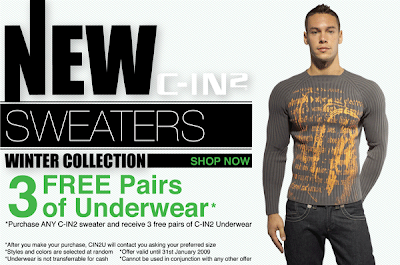 C-IN2 has come out with a new line of sweaters, just in time for frigid temperatures in the east. When you purchase a sweater at C-IN2U you get three pairs of C-IN2 undies. You can get a great sweater and some great undies.