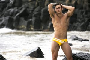 Let’s face it, no matter if you are gay, straight or bi, you have to admit the photography that Marcuse does for their swimwear and underwear is HOT. They pick the best pairs of swimwear and underwear for each model. One of the newest pairs that looks amazing is the Retro suit in yellow. There are two other colors of the Retro, a solid white and black. However, we are profiling the print version in Yellow!