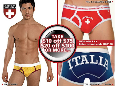 Shop Undergear and you can get up to $20 off your order. To get the savings you must use U8T100 at check out. The sale is $10 off $75 or more and $20 off orders $100 or more. Right now they have some great Andrew Christian gear to check out.
