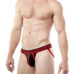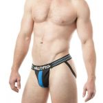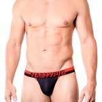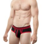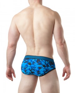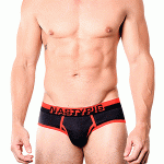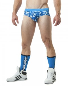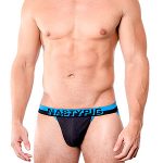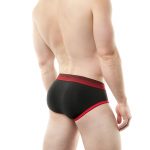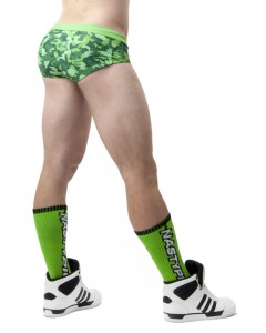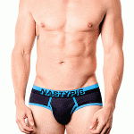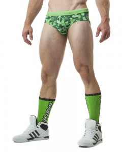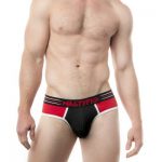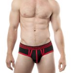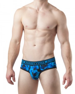 Nasty Pig offers the Ignition in three colors. The green brief has a green pouch, green leg bands, yellow inset panels and a black back. The blue brief has a white pouch, white leg bands, blue inset panels and a black back. The red brief has a black pouch, yellow leg bands, yellow panels and a red back.