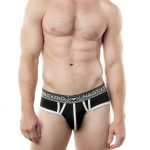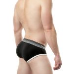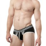 The brief’s 1.5” waistband features a nonrepeating, scripted Nasty Pig logo centered on the front. Each waistband contains the brief’s three colors in varying configurations to complement an overall scheme. The double-locked seams showed no flaws anywhere.