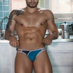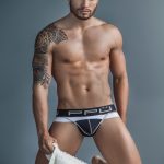 Before trying it on, my thoughts were excited, and hopeful that nothing would FEEL bad about the pair, or that putting it on wouldn’t all of a sudden reveal that it is an awkward color blocking. The dividing line between the black and the white (because I was sent the white) hits mid-bulge, which I didn’t yet know if that would be HIGHLY attractive, or not. Looking at the seams of the underwear, it made me think putting it on was gonna be very nicely “huggy” because it had some really nice contour seams. The black is actually a flat panel on the front, with two panels in the rear (center back seam for butt contouring). The sculpting in front is due to a gentle curved dart on the bottom of the center front white, scooping right under your bulge. This connects, to a “gusset” like panel of white that goes to the low under-butt in back, where it joins up with the black again. The waistband is a woven PPÜ band with a main logo placed every few inches, and then LITTLE logo trailing like a top and bottom border on the band. There is a sewn in woven fabric label on the center back, which you’ll read later, is my ONLY real negative moment with this review.