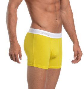 I recently received, from my underwear subscription service. A small simple box with the word Wood printed on it. A small square gave a preview of the canary yellow undies inside. This small trendy box would be at home on the shelves in the apple store. I love it! The product inside was even better. A simple yellow boxer brief with a white waistband, Wood stitched in a subtle gold on the band off to the right.